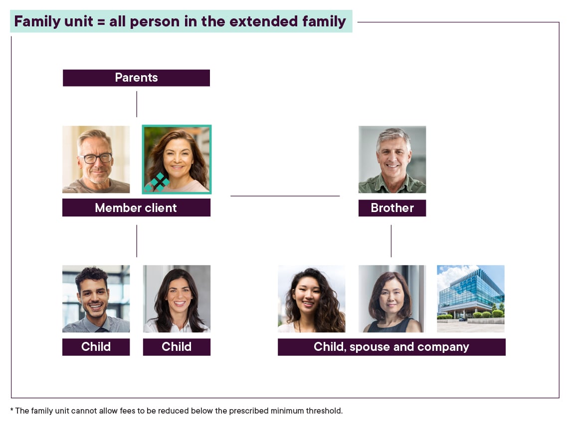 - All persons in the member’s extended family are eligible, as are their spouses and descendants. There is no limit to the number of generations or family members eligible. However, a minimum investment amount is required for each household wishing to take advantage of this offer.