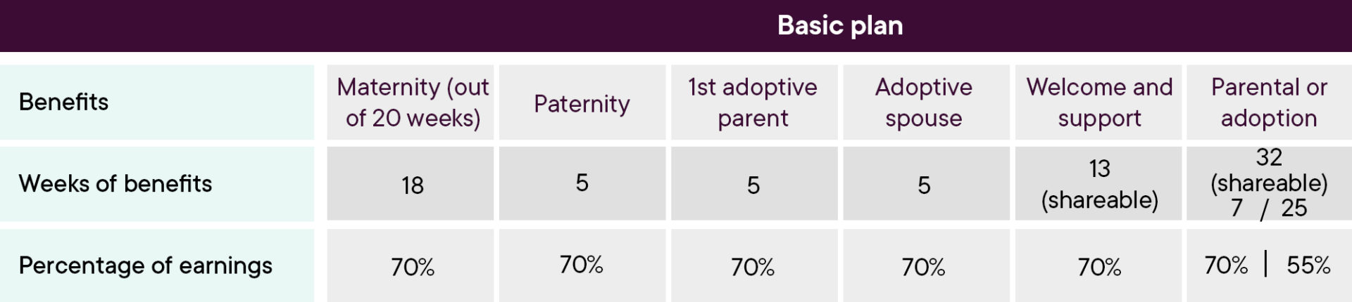 Basic plan: 5 additional weeks of parental or adoption benefits at 70% of insurable earnings.