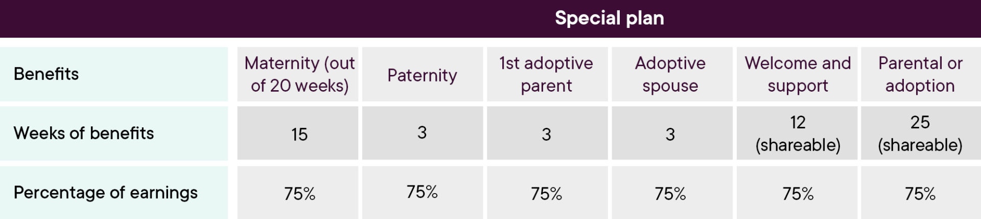 Special plan: 3 additional weeks of parental or adoption benefits at 75% of insurable earnings.