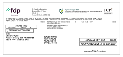 - Selon le type de transaction et selon la plateforme d’investissement, un avis de transaction est généré lorsqu’il y a un achat ou une vente d’un titre dans un de vos comptes.