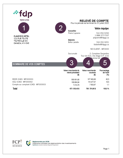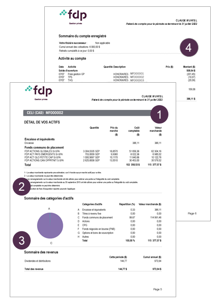 - Il comporte trois (4) sections : le relevé de compte présente le sommaire et les répartitions; le supplément au relevé de compte présente le rendement et les frais.