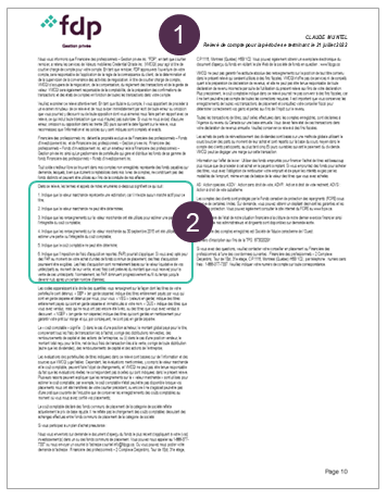 Dans le but de vous fournir des conseils et de gérer votre compte, fdp peut obtenir une rémunération de tierce partie liée à des titres que vous détenez ou pour des tâches particulières exécutées. Une telle rémunération peut inclure des paiements de commission ou de frais d’administration provenant de CPG (Certificat de placement garanti) ou de fonds d’investissement, des commissions pour nouvelles émissions ou des frais associés à des référencements d’un client vers un tiers. Veuillez noter que la notion de référencement est non applicable chez fdp Gestion privée.