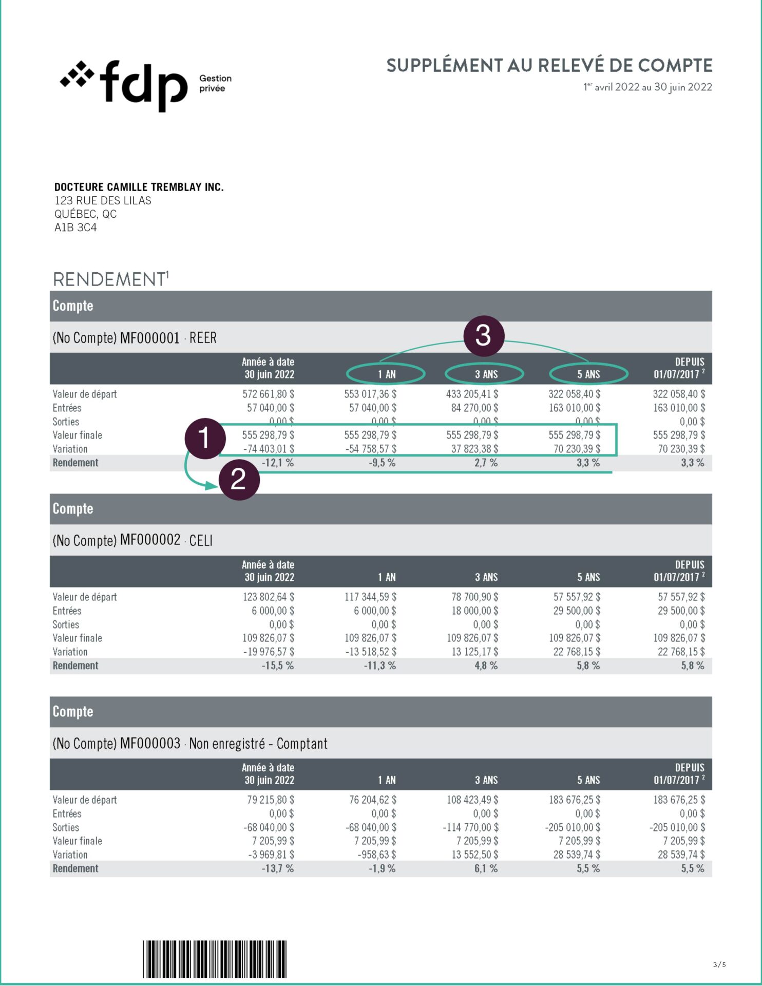 - Il comporte trois (4) sections : le relevé de compte présente le sommaire et les répartitions; le supplément au relevé de compte présente le rendement et les frais.