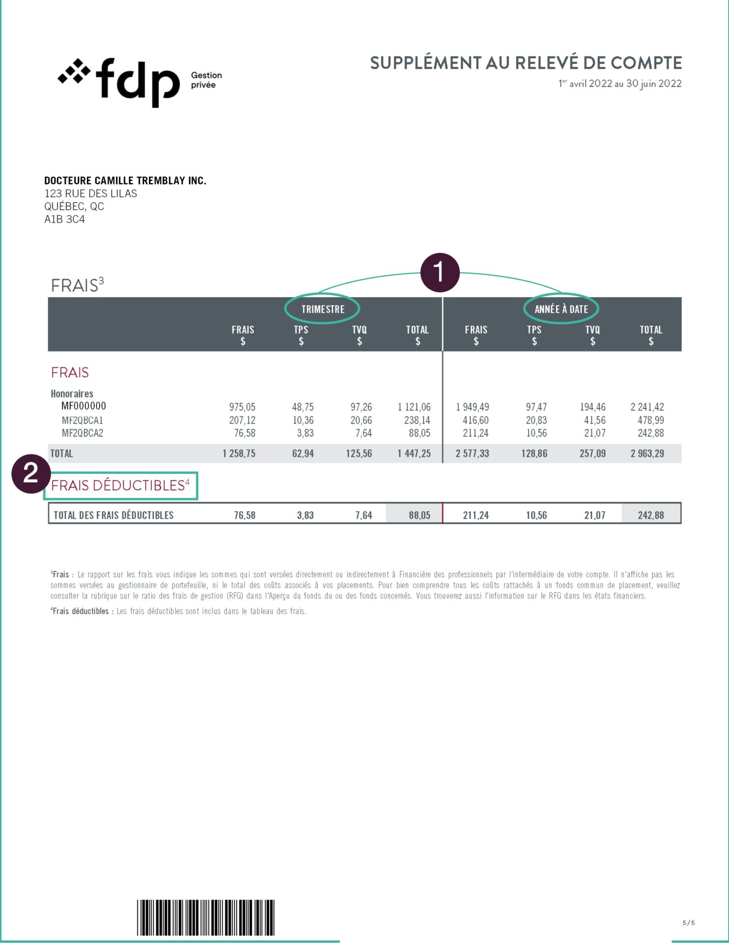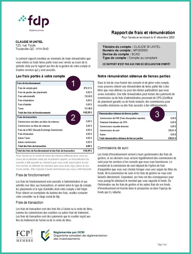 - Ce rapport produit sur une base annuelle présente les frais et honoraires perçus et versés directement ou indirectement à fdp au cours de la dernière année pour chacun de vos comptes détenus chez fdp.