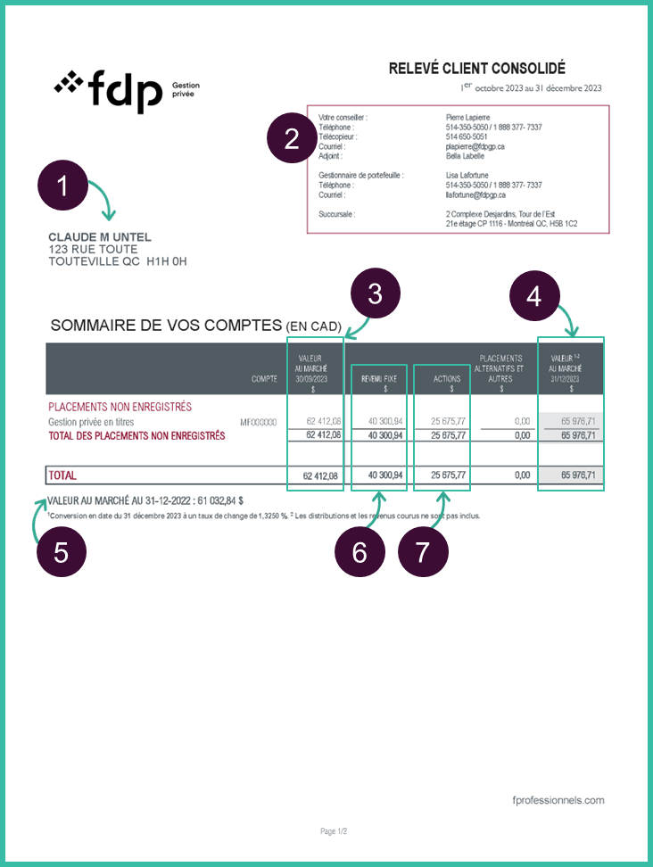 - Votre relevé consolidé vous permet de suivre l’évolution de vos placements en présentant la valeur marchande totale de vos comptes en dollars canadiens, tant pour la période courante que la précédente.