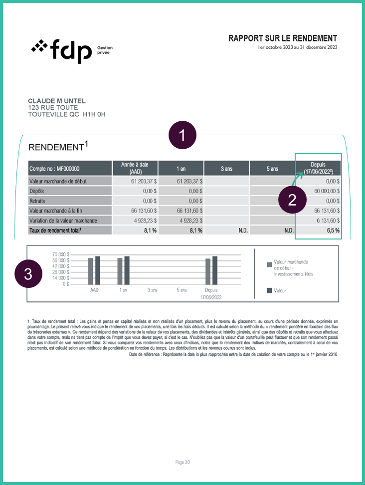 3. Au fil du temps, ce rapport inclura des informations sur différentes périodes : cumul annuel jusqu’à ce jour, 1 an, 3 ans, 5 ans et pour une période de référence qui représente la plus rapprochée entre la date de création de votre compte ou une période de 5 ans. |