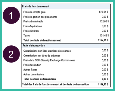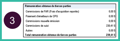 - On y retrouve trois (3) zones d’information sur les frais de fonctionnement, les frais de transaction et la rémunération obtenue de tierces parties.