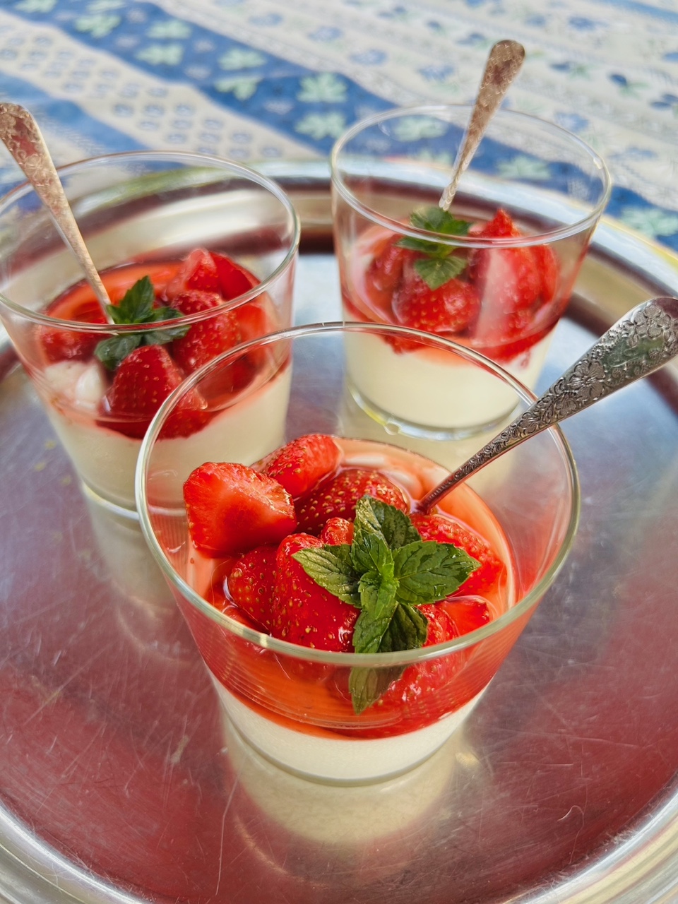 « Ces desserts ont chacun leur charme et leur moment idéal : le panna cotta aux fraises macérées demande un peu d’anticipation, car il doit être préparé la veille ou tôt le matin pour être prêt au souper. Le semifreddo, tout en fraîcheur, se marie à merveille avec des fruits, un coulis ou une sauce au chocolat. Quant au gâteau au miel, il est parfait pour le goûter, accompagné d’un thé ou d’un café — et il gagne en saveur après une journée de repos, alors mieux vaut patienter avant de le savourer. À vos cuillères… et bon dessert ! ».