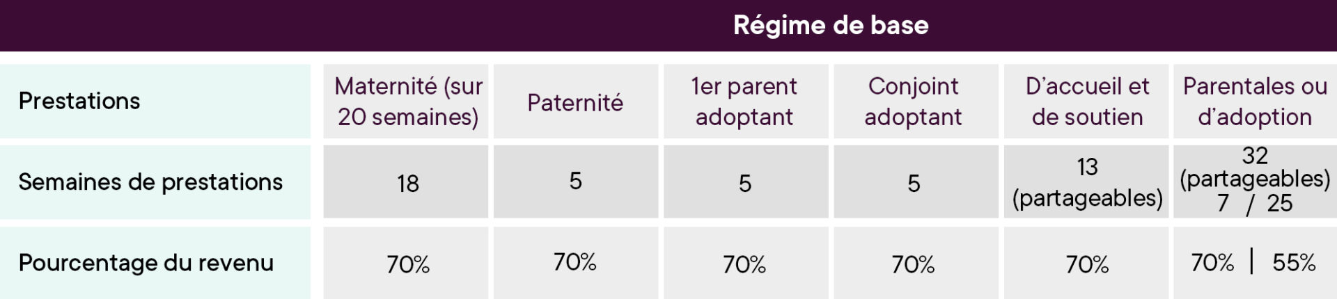 Régime de base : 32 semaines de prestations partageables – les sept premières sont à 70 % du revenu assurable et les 25 restantes à 55 % de ce même revenu.