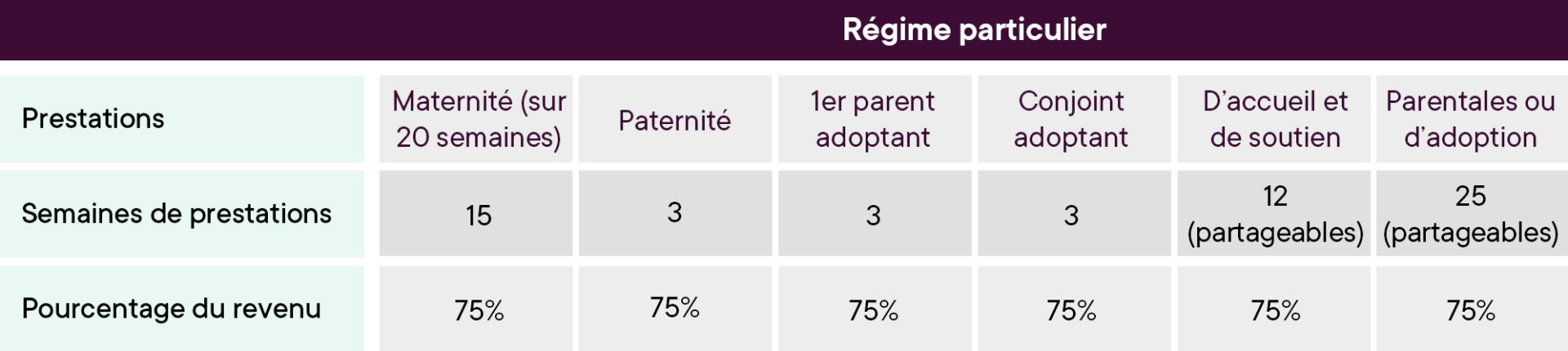 Régime particulier : 3 semaines s’ajoutent aux prestations parentales/d’adoption de chaque parent à 75 % du revenu assurable.