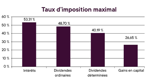 Voici un aperçu du taux d’imposition selon les trois catégories de placements. Les revenus générés ne sont pas imposés si vous les déposez dans un REER, un REEE, un CELI ou un CELIAPP.
